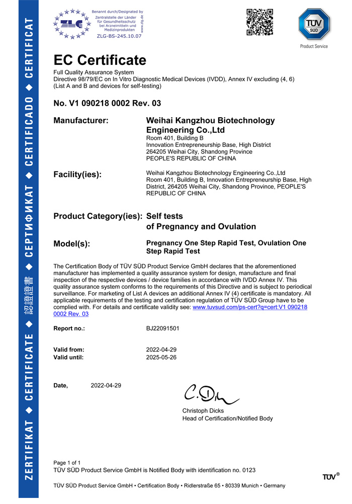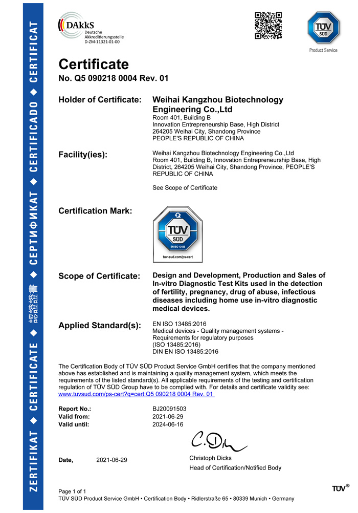 ? ? ?威海康州生物工程有限公司成立于2013年,公司坐落于風(fēng)景秀麗的海濱小城——威海市??抵萆锸羌邪l(fā)、生產(chǎn)和銷售于一體的生物科技公司,與威海哈爾濱工業(yè)大學(xué)合作研發(fā)團(tuán)隊(duì),擁有先進(jìn)的科研基地及生產(chǎn)基地。主要從事快速診斷檢測(cè)產(chǎn)品的研發(fā)、生產(chǎn)、銷售。產(chǎn)品涵蓋:生育檢測(cè)、藥物濫用檢測(cè)、農(nóng)藥殘留檢測(cè)以及其他臨床診斷檢測(cè)等。公司自主研發(fā)生產(chǎn)得早早孕試紙,排卵檢測(cè)試紙,毒品檢測(cè)及疾病檢測(cè)等醫(yī)用產(chǎn)品,經(jīng)過歐盟認(rèn)證,產(chǎn)品質(zhì)量穩(wěn)定,值得信賴。